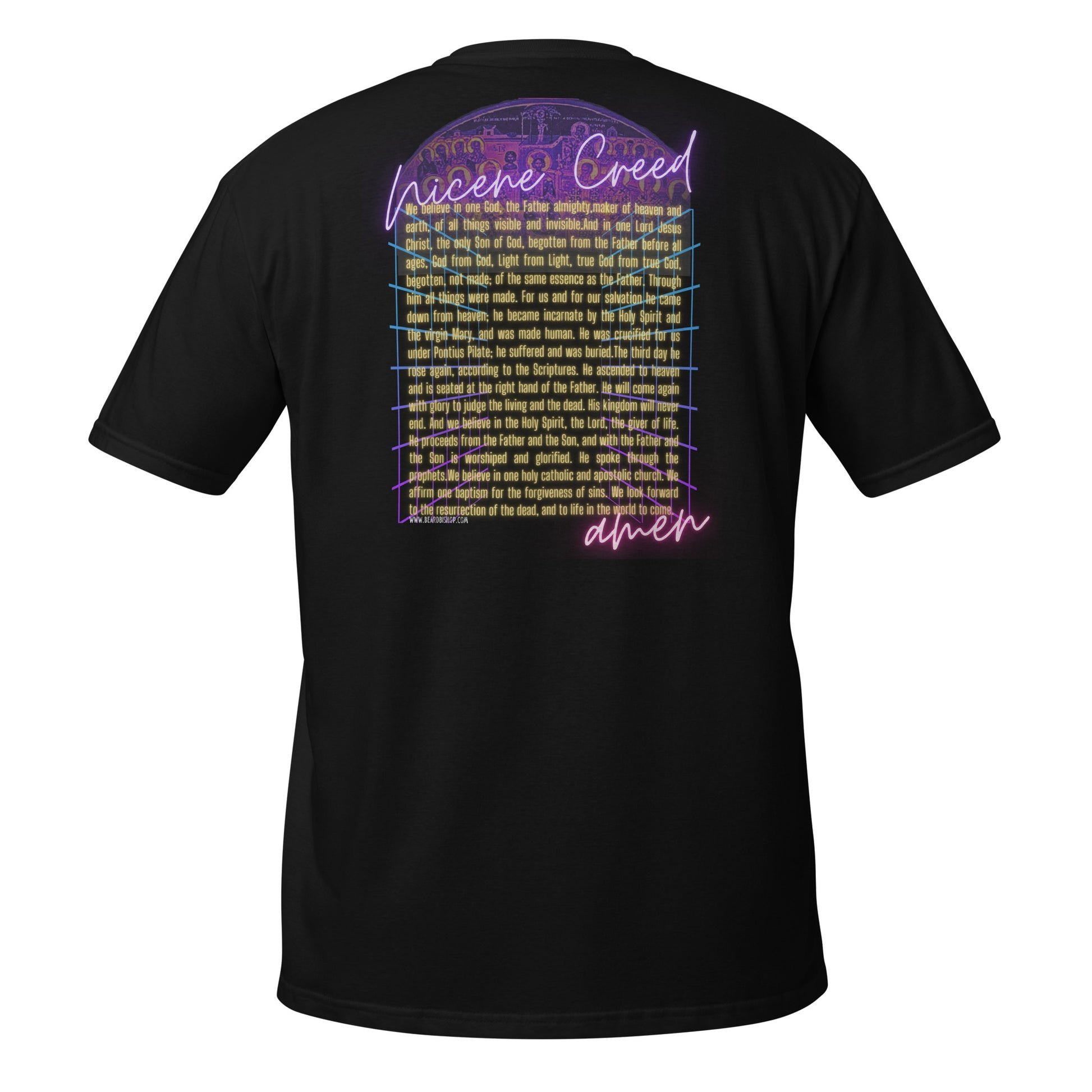 Get the shirt inspired by Beard Bishop's Signature Beard Balm: Nicaea Nights.  With the neon logo on the front and the Nicene Creed printed on the back, you can stand for Trinitarian orthodoxy in style.